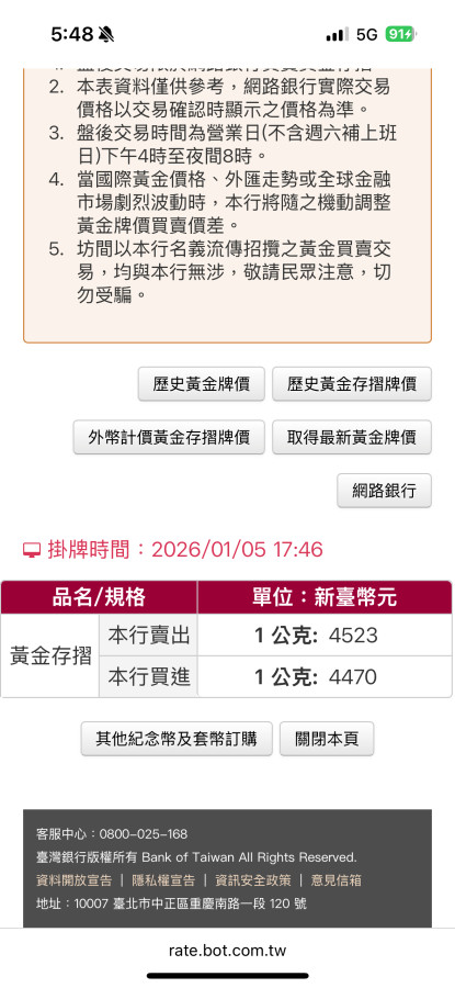 台銀雖然小面額的庫存不多,但250 / 500 1000 g 的應該還是有。