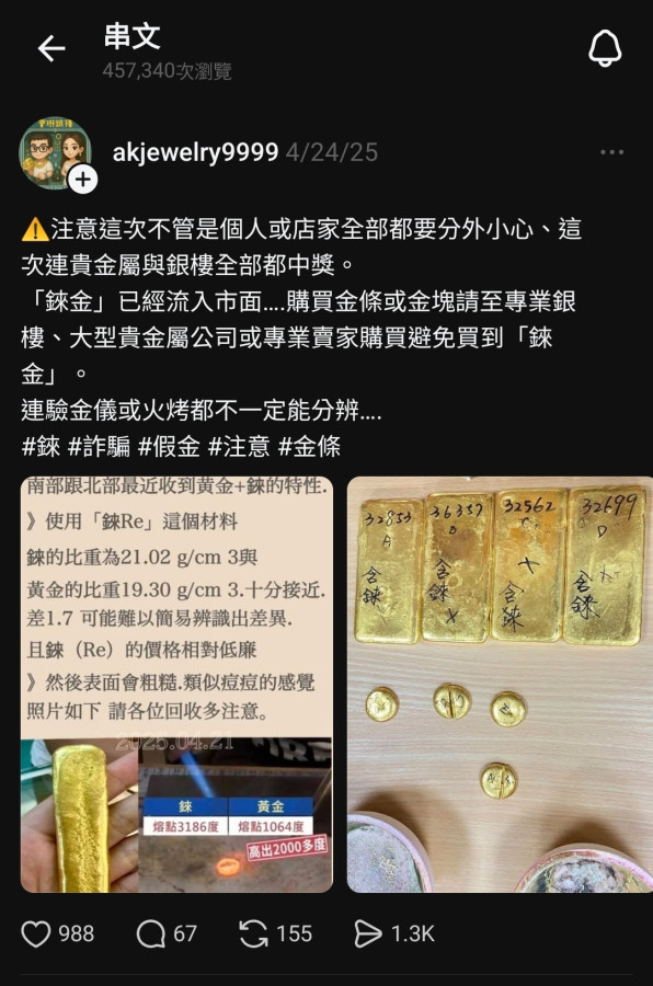 回覆 Gain:銀樓跟貴金屬門市應該更喜歡收條塊上切下來...