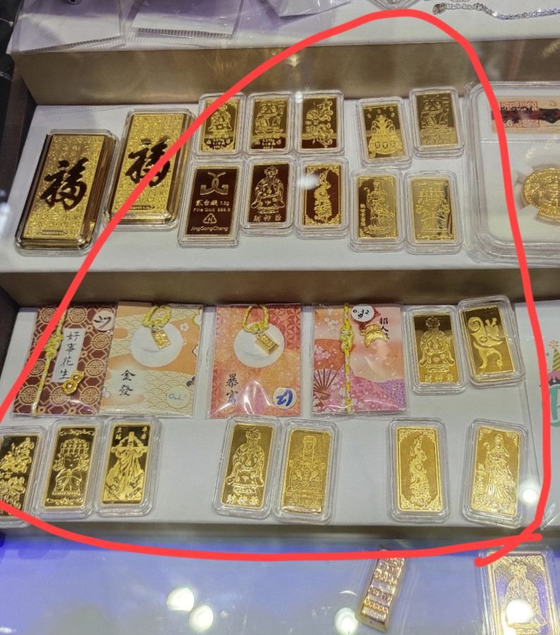 ↓下圖是我在銀樓拍的,紅框內有1錢和2錢(厚度不同),之前我有買過1條,銀樓說是9999純金,應該什么沒問題,不知其他前輩有何看法?