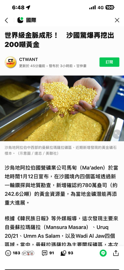 這種新聞都是有心人放的,沙漠開採多困難,水洗式洗礦機沒水,只能用風吹式,沙漠裏面運輸挖堀非常不容易,200噸才200億美元,沙烏地阿拉伯缺這200億嗎?投入資金設備人員根本不划算,不如多挖些石油。中國那幾處也是早探勘,太困難開採,不如說地心有幾兆噸黃金,等開採