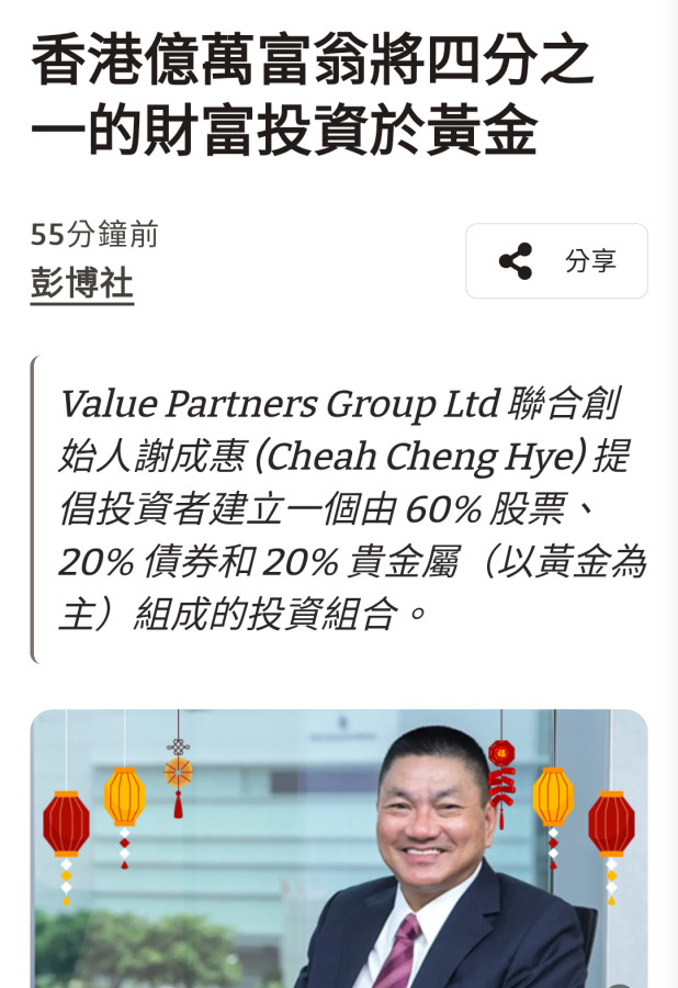 即使金價不斷創下歷史新高,Cheah 對黃金的看漲觀點也使他成為超高淨值投資領域中一個明顯的異類。