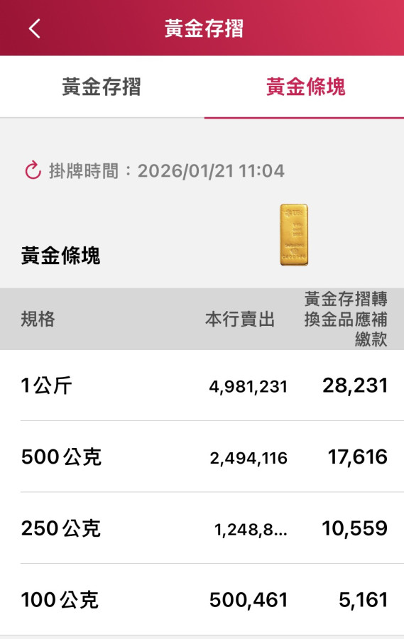 台銀100公克的金條,50萬了