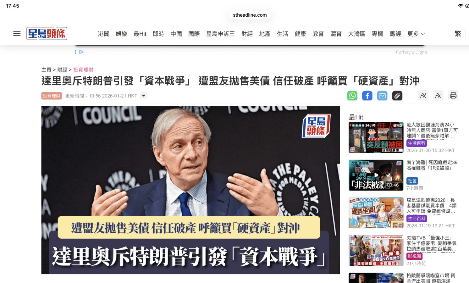 美國總統特朗普威脅要向反對將丹麥自治領土格陵蘭出售予美國的國家徵收新關稅,令周二美國國債價格顯著下挫。有「鱷王」之稱的全球最大對沖基金橋水(Bridgewater)創辦人達里奧(Ray Dalio)近日更於達沃斯世界經濟論壇上警告,特朗普近期的強硬政策,可能觸發國際「資本戰爭」,持有大量美元和美債的國家可能不再願意為美國財政赤字提供融資,動搖全球金融秩序。