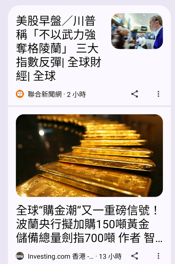 川普說不會用武力奪取格陵蘭,美股大漲金價跌下去。