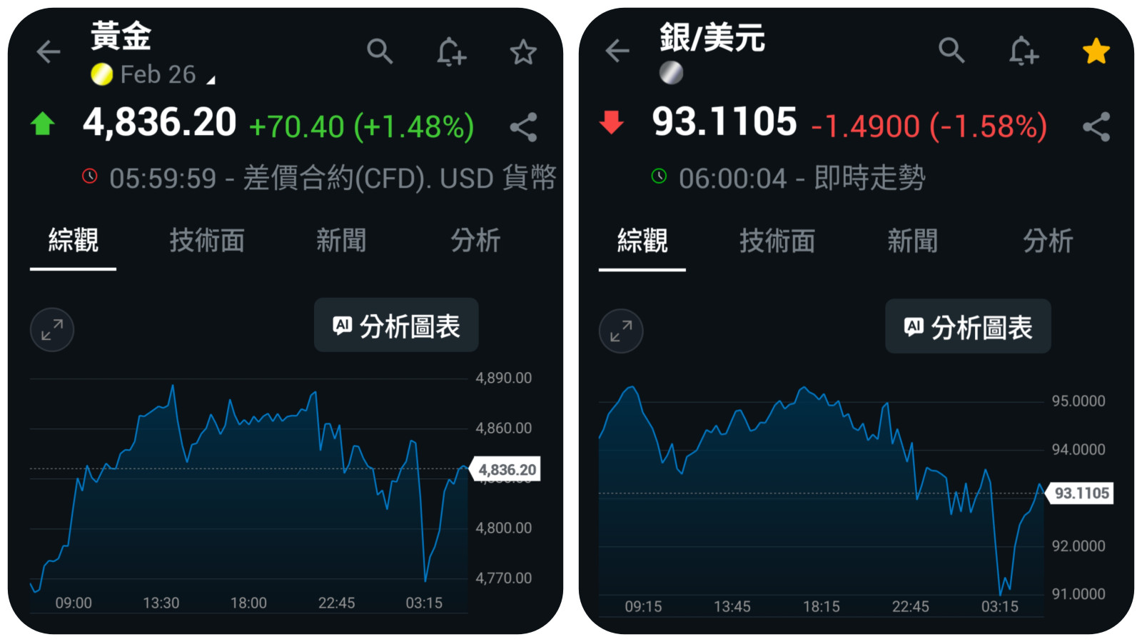 不知道發生什麼事情,只知道金銀價格短期間的漲幅高度吻合,可見是機構程式單。