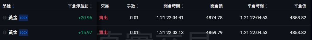 昨晚這個拋售我們都很難及時參與, 但更早之前有一單很神奇的拋售, 我接到了1/21 22:04:41~22:04:53 這12秒 黃金掉了21刀我捧到了兩單, +36.9刀