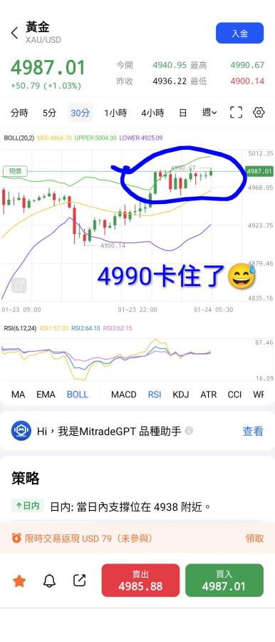 回覆 利金顫:1/24AM 06:00黃金收4987....