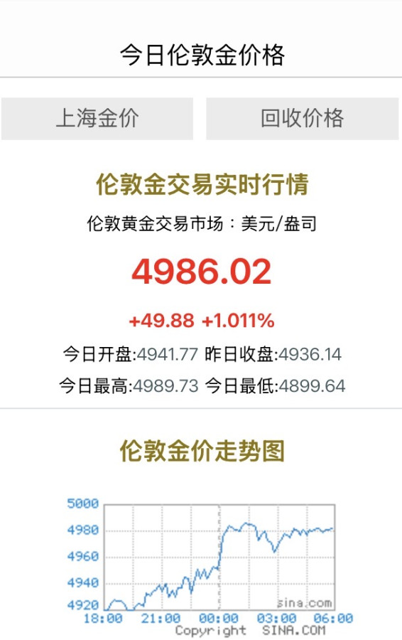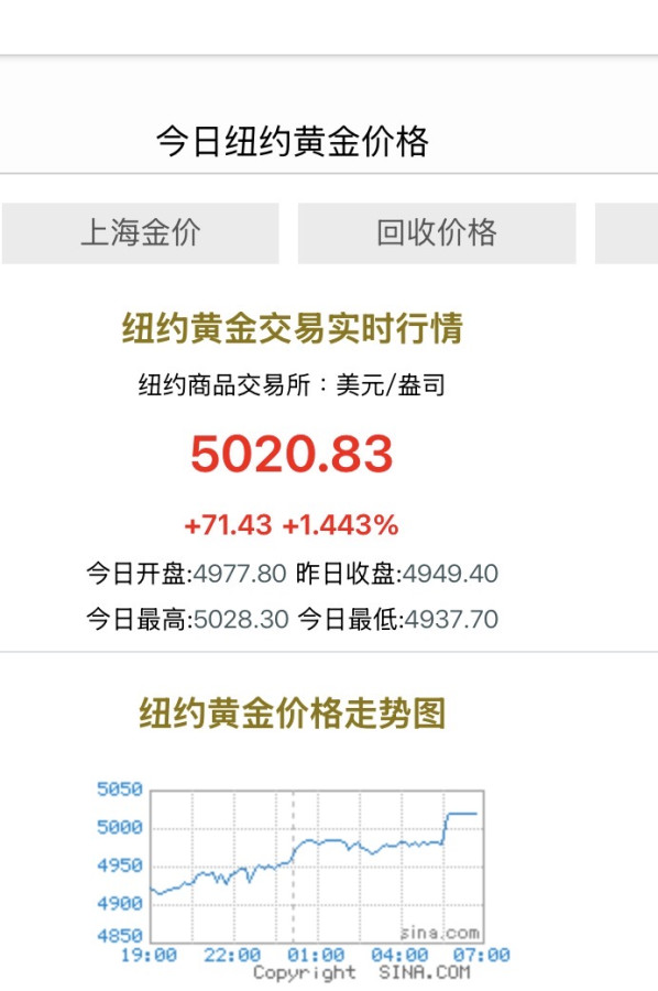 現在各個地方,黃金都有價格差異。但看最主要的倫敦。紐約,及上海交易所,收市價。我覺得已經突破了5000元美元關口了⋯⋯