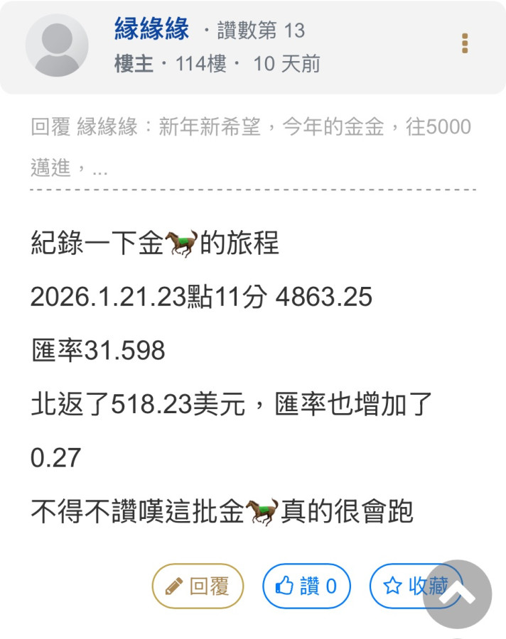 你當成老天給你一次機會,時光回溯到1/23,當時金價還不到5000。