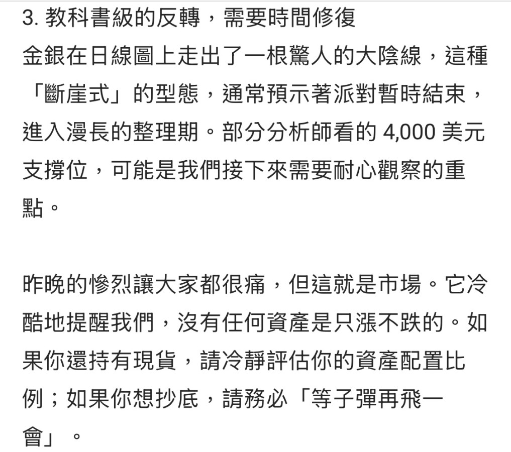其實這次大跌我沒什麼擔心,央行還在大買,美債也沒變化,這兩天以前鷹派的新聯準會主席應該會出來放鴿,迎合川普降息目標,還有如果伊朗沒談和成功,新聞說這兩天就等川普下令進攻,伊朗不是吃素的,不然川普早進攻,所以戰或和我不敢猜,這次下跌原因大概是追加保證金5.5變成6%,做多的人太多,槓桿拉太高沒錢補被強制賣倉,機構也順勢殺,再觸發各機構的停損點,推骨牌一樣殺下去,才會這麼恐怖拉不住,目前金價大跌,各國央行會買更多,對美元失去信心,全世界都一樣,德國放美國的黃金要不回,美國可能暗槓走了,最近德國內部也在炒,要政府要回黃金,但是沒美國皮條,如果你確定賣掉實體黃金將來還能買到,覺得還會跌就賣,錢自己的,自負盈虧