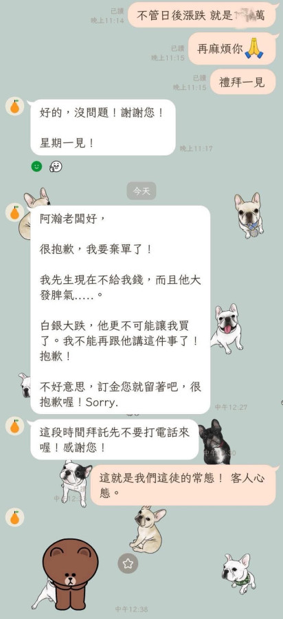 這漲客人只管賺  這跌30趴  阿瀚沒收到全額款就去辦貨 這客人棄單  貨自己吃  扛得腰都會斷  這就是貪做 壓死自己! 貴金屬那能付個訂就成交  除非你有 存貨底  約好時間取貨  不來 訂金沒收  絕對不能扛自己 扛不住的 擔    生意 就是客人 上手盤商  三者之間的 金流控管  若有疏失  算誰的?? 沒有何ㄧ方能擔  這客訂金付的一訂不多  ㄧ夕下殺30趴  他就先跑  瀚老闆 就自己 扛 啊  ……. 能怪誰  誰都是 賠錢那 幹!!!!!