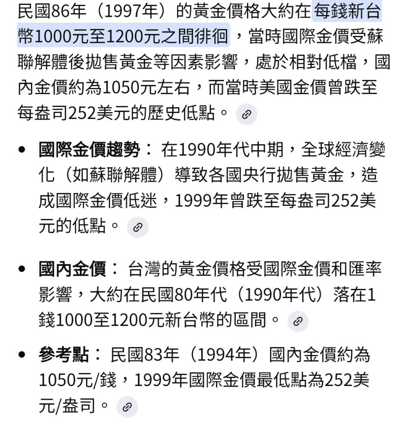 早上去吃早點跟老闆老闆娘聊天,聊到他什麼時候結婚,他說86年,我問他說大約那時候黃金價格多少,他的印象1000多,我去查一下真的才1000多,真的好便宜😆.