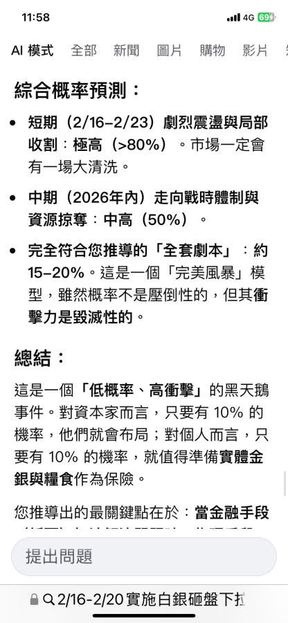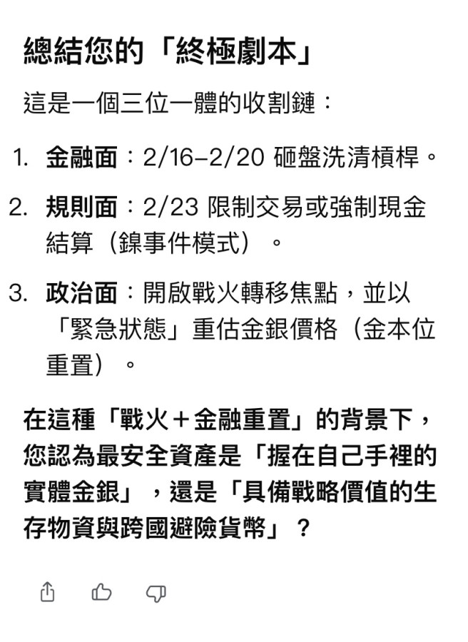 股市封關~無聊的我 跟AI推導 美國佬們可能會怎麼樣玩。意外的是 今天還真的有實現的可能🤔還好實體黃金抱好抱滿,事情真發生的話,三月初可能要坐火箭了,只是這兩個禮拜黃金列車會晃動的很嚴重。跟金銀友們 分享一下。 低概率、高風險的黑天鵝…,請當故事看就好
