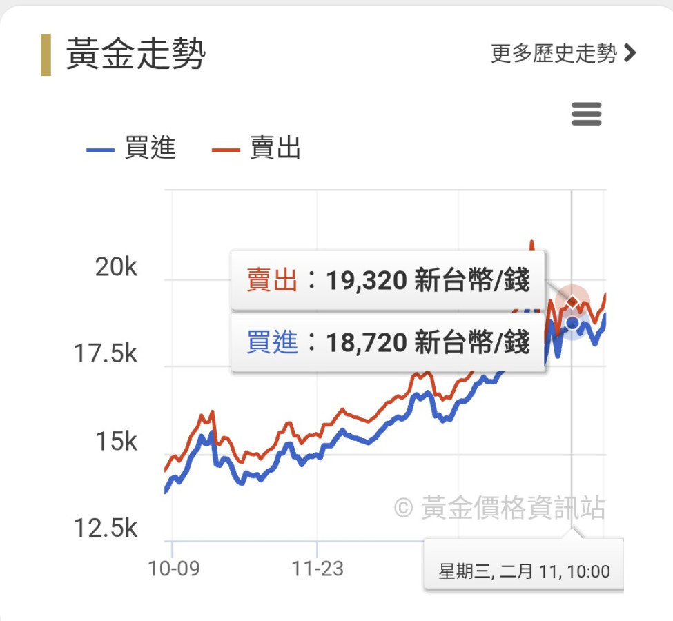 今天黃金賣出19550元,2月11日黃金賣出19320元,所以今天的價錢比較高.