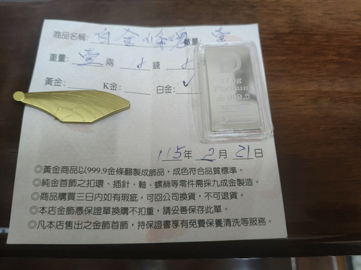 今天初五開工日討個吉利,我只買白金喔沒買黃金唉,就當做買張樂透吧 。