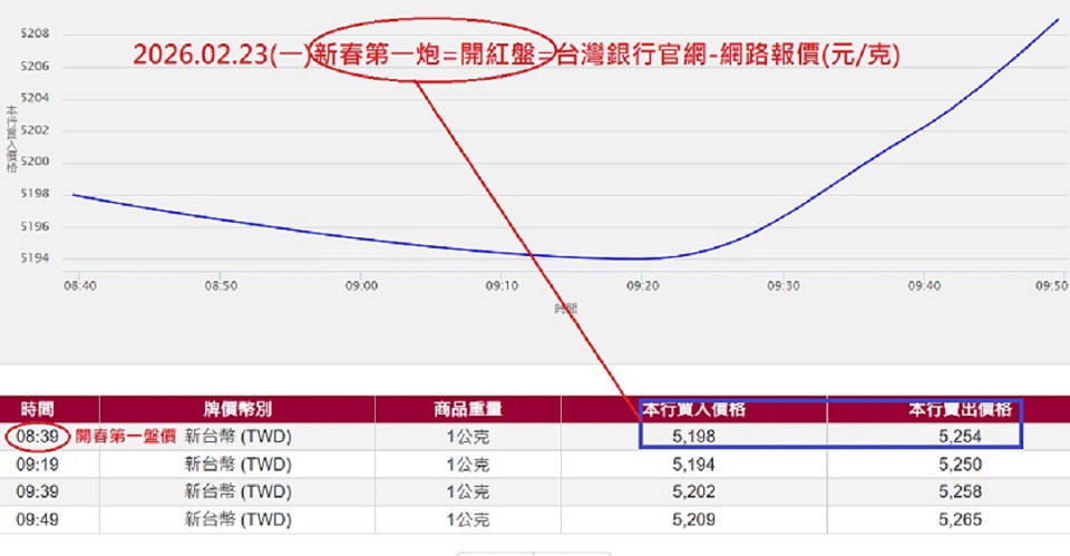 今日2/23第一盤價08:39賣出=5198(最高達5209)元/公克