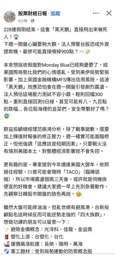 回覆 雄大:有分析師預測明天台股崩盤900點......