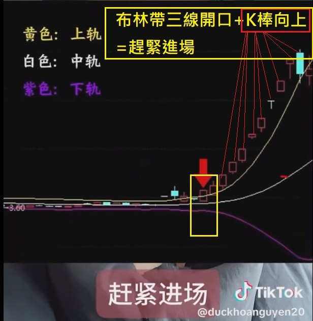 第一步=三線向上(K棒在上軌~中軌間)往前推進=買在中軌+賣在上軌