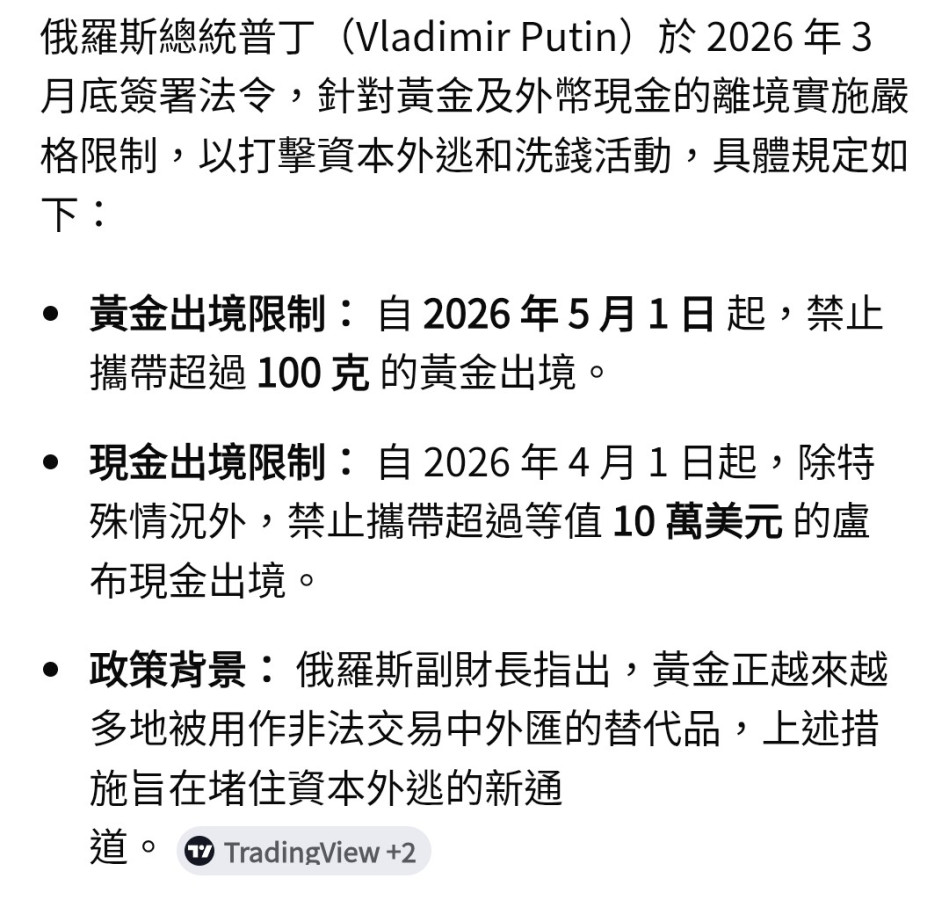 俄羅斯總統普丁簽署法令,自2026年5月1日起,個人攜帶出境的黃金金條重量限制在100公克以內(約1.5萬美元)