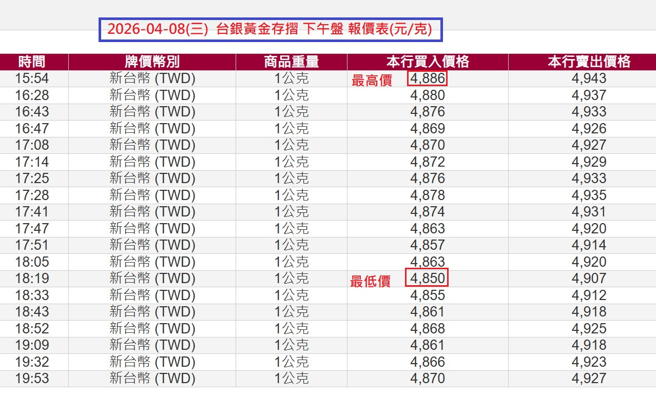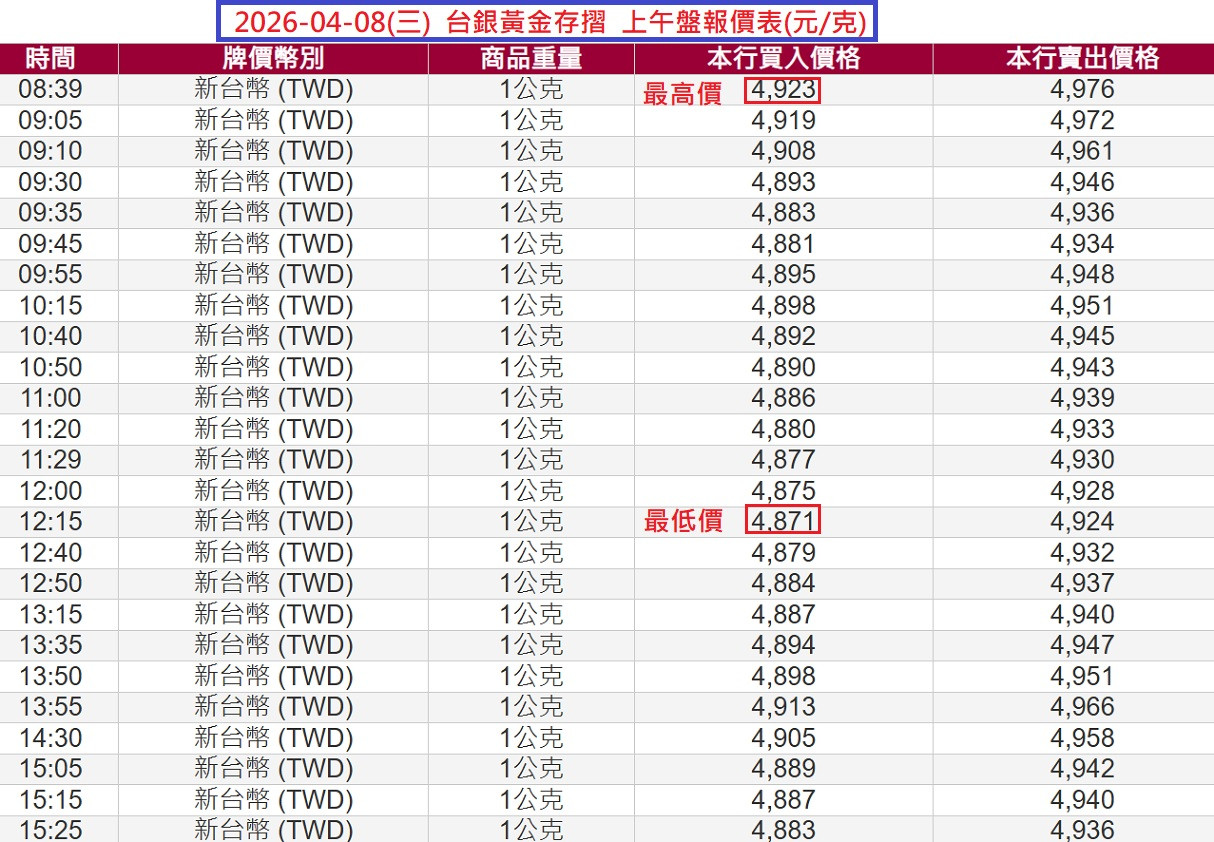 4/8台銀黃金存摺上/下午盤報價表