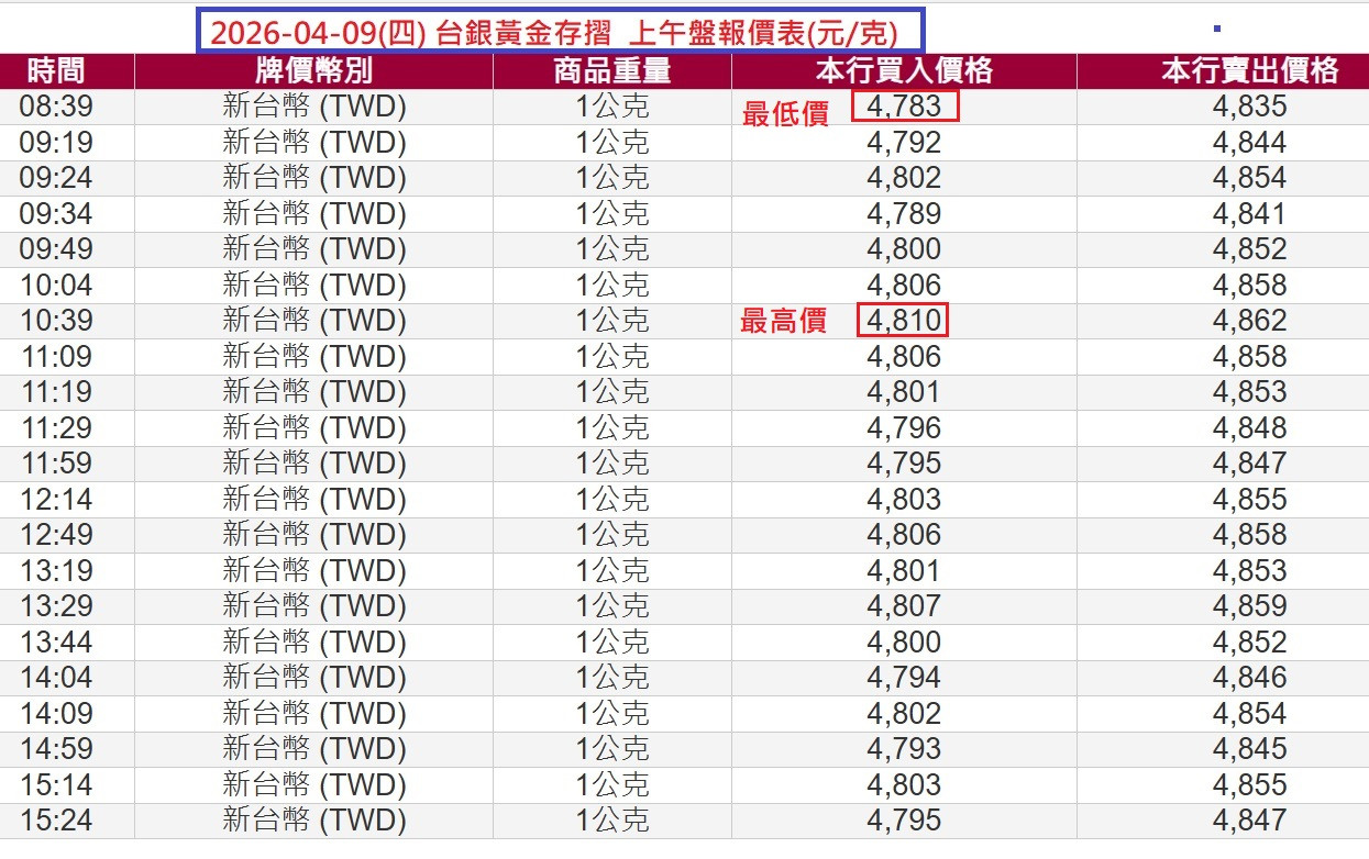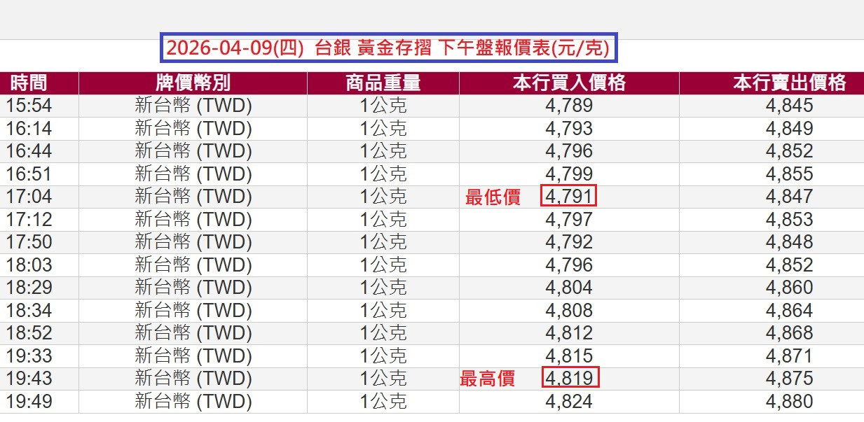 4/10台銀黃金存摺上/下午盤報價表