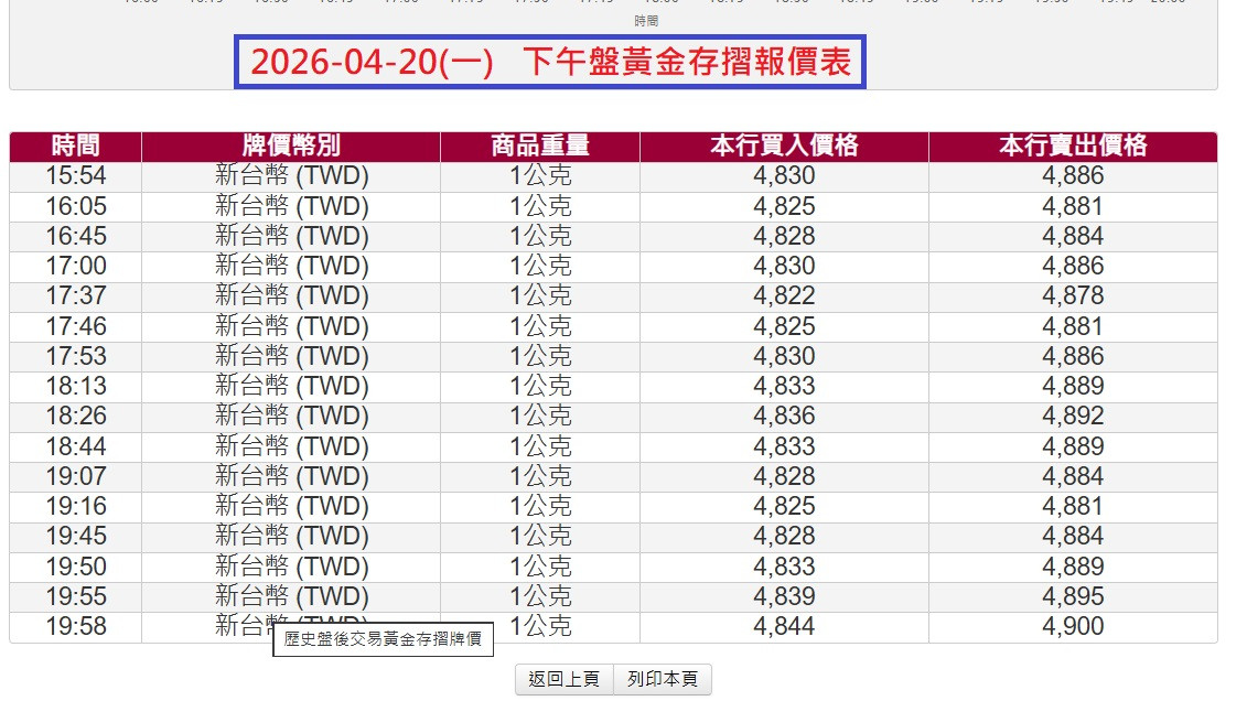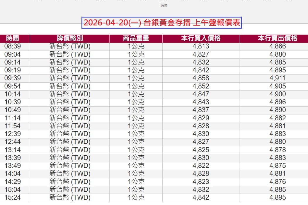 04-20(一) 台銀黃金存摺報價表