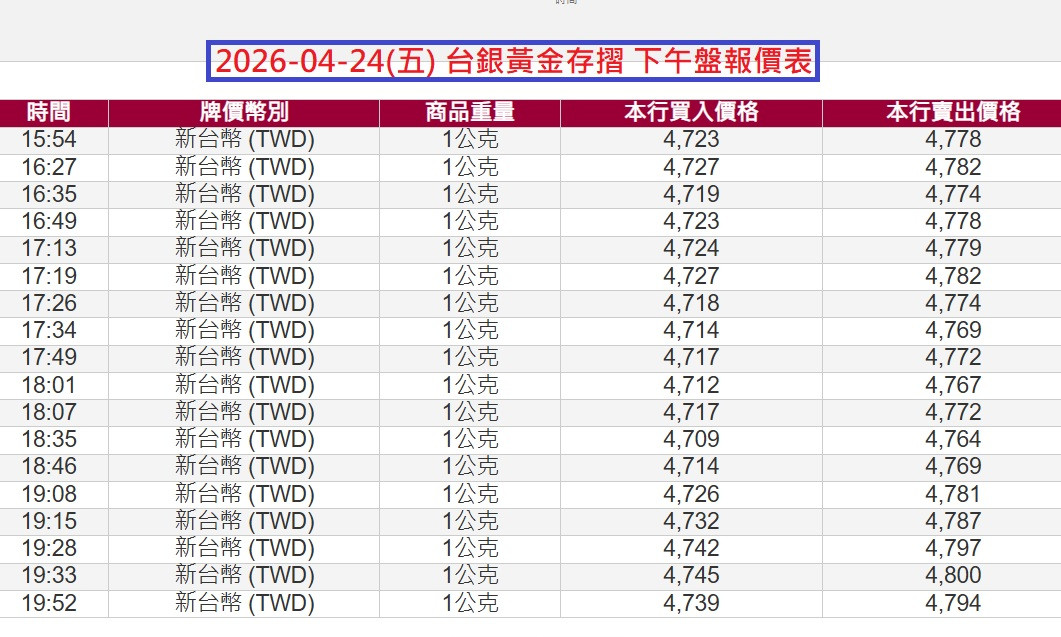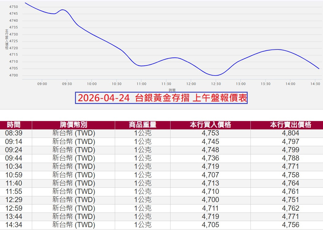 4/24=台銀黃金存摺報價表