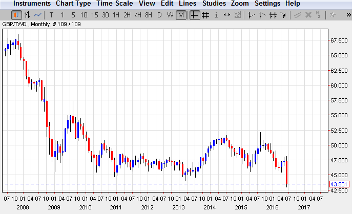 上圖是英鎊兌新台幣的價格月K線圖(2007年7月到2016年6月27日)