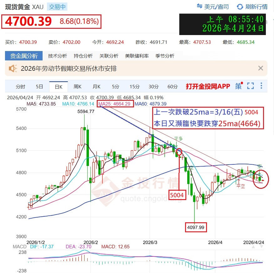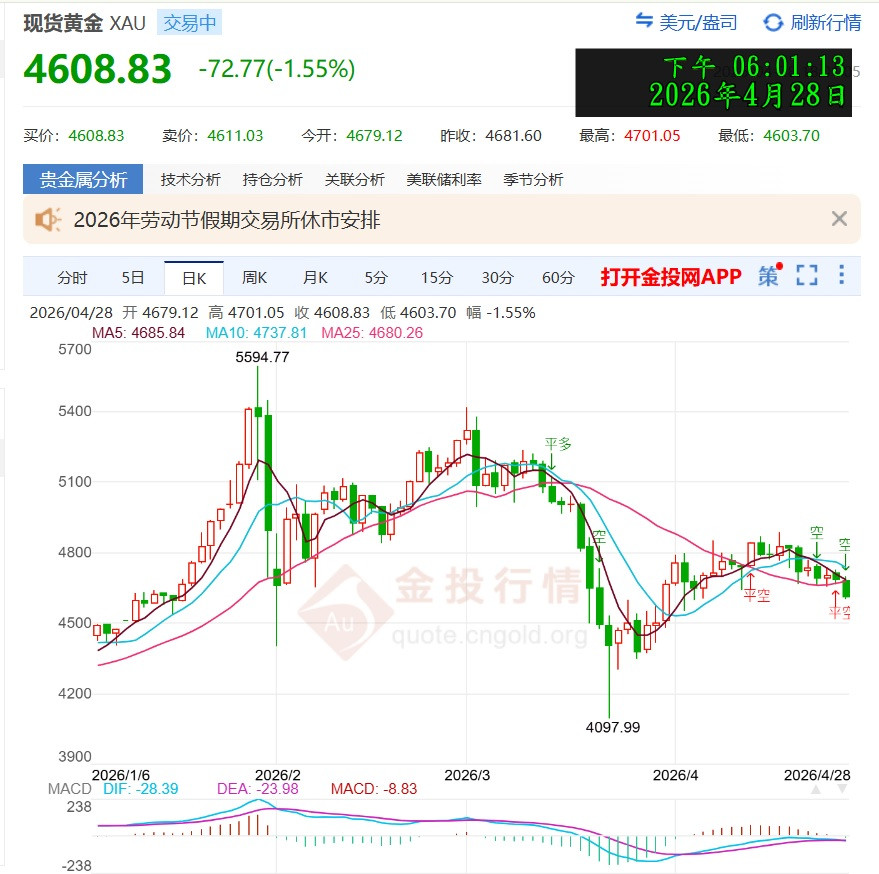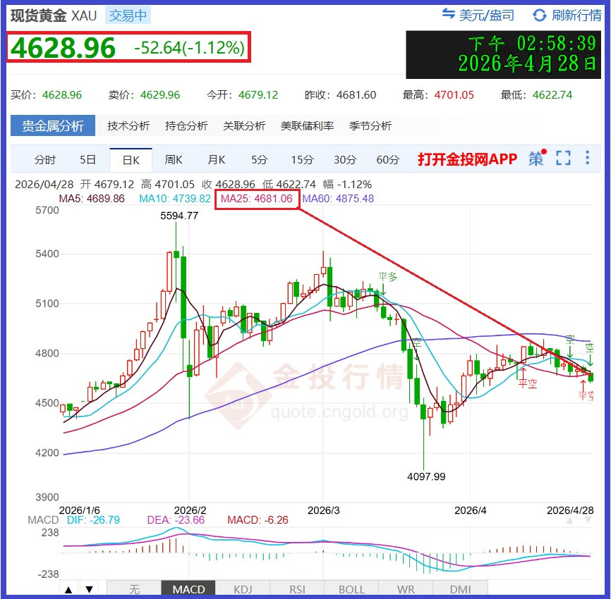 今日4/28=4608與4/24=4700美元>相差4天=差價-92美元