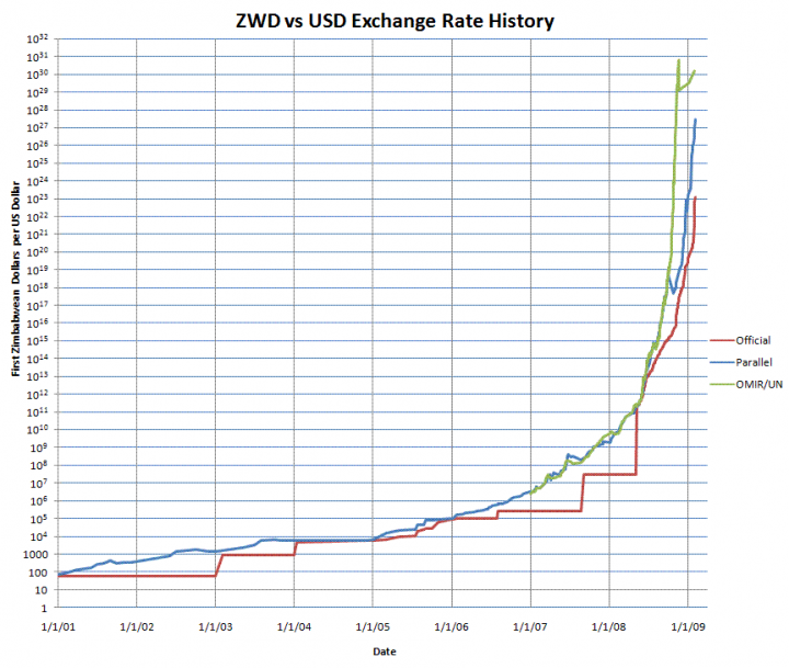 2015年6月,辛巴威政府宣布棄用辛巴威元,民眾可將存在銀行帳戶內或持有現鈔的辛巴威幣,向辛巴威儲備銀行換成美元,匯率是3.5×10^16辛元兌1美元。