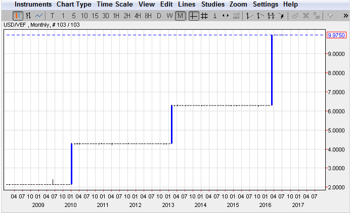 美元兌委內瑞拉幣由2009年1兌2.1貶值到2016年1兌9.975