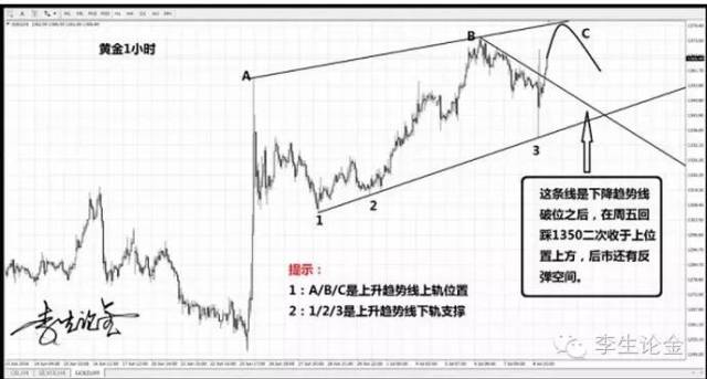 这一次,非农从3.8变到了28万上方,虽然周五的走势并未给非农买单,但从图中不难发现,先是拉到了1364附近,这是大于前值小于预期会出现的走势,而跌到了1335的点,前期形成的支撑位置1、2、3点完美的吻点,中途刷新1370后又回调1350,但有一点要注意,就是凌晨收盘很强势,这种强势的收盘直接越过了下降趋势线(图中箭头方向),并且收于此位置的上方,也就意味着短期黄金还有继续挑战A/B/C这三个点的区域,而这个位置最少在1380,金价将有望向1380-1400的区域迈进。