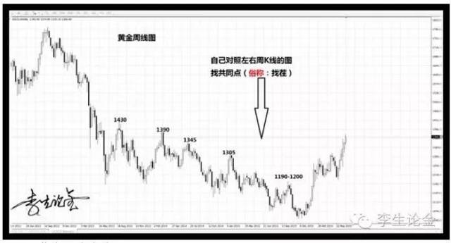 然而,在下面这张周线图当中,不知读者朋友有没有发现,黄金从1046上涨,第一波是直接越过前面的高点1190-95的区域,到了1305-1310的区域也就是第二次的高点形成了回落,这个回落刚好也是靠近了1190-1200的范围之内,周线上差几美金是很正常的误差。
