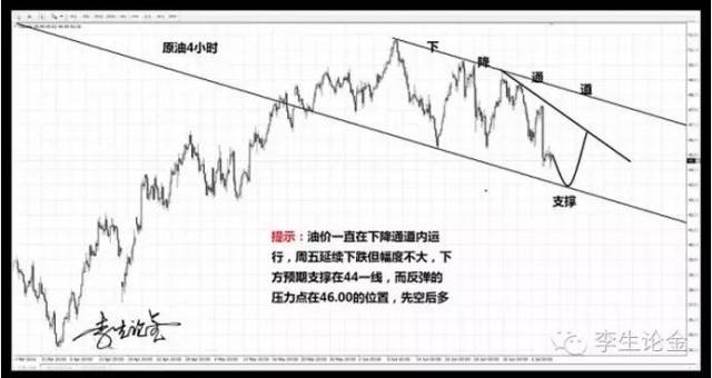 接下来,以46为防守的止损点,继续空原油,下方支撑在下降通道下轨的位置,这个点预计在靠近44一线,那么从现在的价格来看还有一定下行的空间,周一要空肯定不能等反弹破位46了再空,反弹了空就是以周线为压力点,但目前的走势更偏向于46下方直接空,博一个亚盘的续跌走势,亚盘延续下跌走个急跌,44就有可能反弹再次确认,整体看空但肯定不在靠近44了还追空,必定这是下轨支撑点。