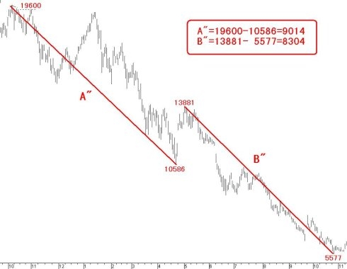 深证成指将近一万五千点的下跌趋势,可以分割为A"和 B"两个超大段,这两个超大段的下跌绝对值分别为9014点和8304点,相差仅为710点。(上图)
