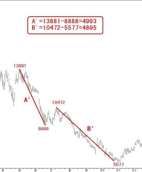 这个下降趋势的第二超大段B"可以分解为两个大段A'和B',两者的下跌绝对值分别为4993点和4895点,两者相差仅为98点,近乎相等!(上图)