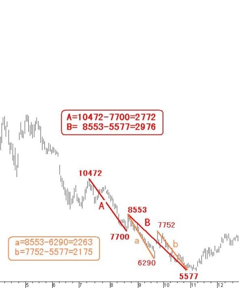 第二超大段的第二大段又可以分解出两个中段A和B,其绝对下跌值分别为2772点和2976点,两者仅相差204点。其中的第二中段B又可以分解出两个小段a和b,两者的下跌绝对值分别为2263点和2175点,仅相差88点。(上图)