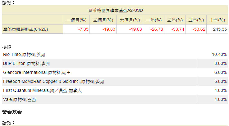由上圖可知,這些投資開採黃金礦業的基金,非常團結的慘賠成一片,