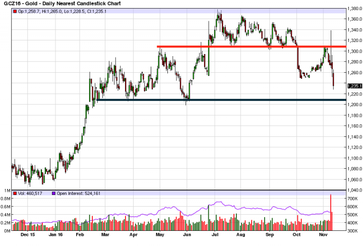 The price action throughout October and early November can be interpreted one of two ways. One, the move out of the $1,243 low was an extended oversold bounce in an ongoing intermediate-term correction and gold prices are very close to forming a lasting low. Or two, the move out of the $1,243 low was an intermediate cycle that failed after just 5-weeks, and prices will continue lower into the first quarter of 2017.