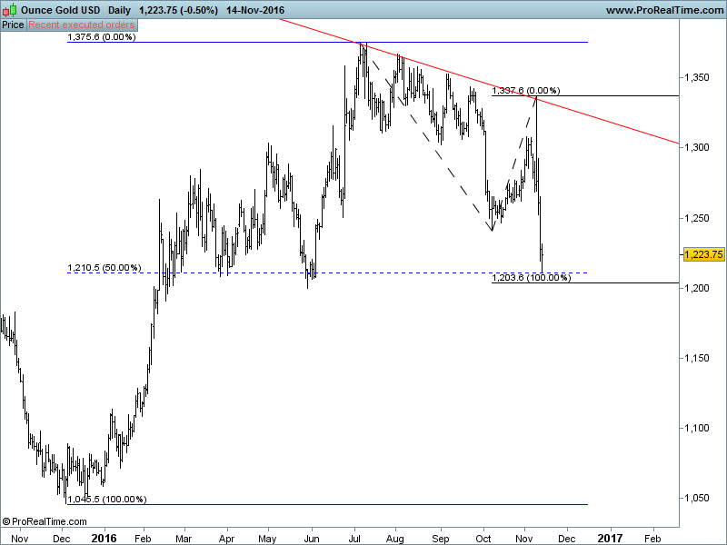 如果我們仍然被困在中期的下降趨勢裡,那麼黃金價格要么上週觸底或他們很快會觸底。很可能,大型銀行會嘗試在$ 1,200下面,停損,造成突然停損賣壓,以便大量進貨。如此一來,我預計可看到大跌之後,很快的漲回 1200。相反,如果價格不從下面$ 1,200急劇下降快速恢復,那麼,第二種推論的機率就會提高,接下來,我們就要跌到真正的8年週期的低點 (可能低於1045)。