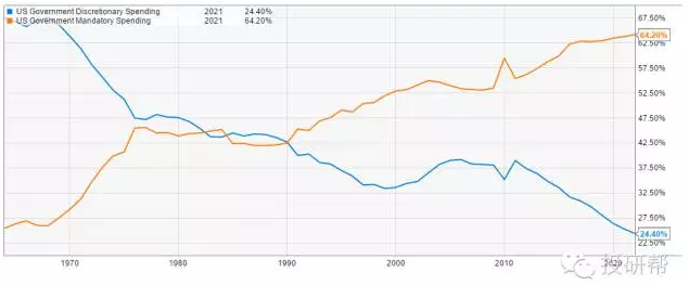 【小科普:藍線是Discretionary spending,是撥給各部門的預算,軍費佔大頭,每年需要國會批才有錢拿。 而黃線是Mandatory spending,是憲法規定必須花的錢,除非改憲法,否則一分不能少。 】