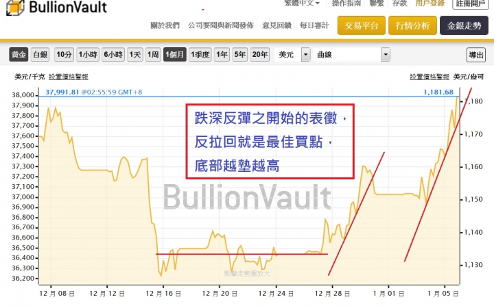 從去年2016七月(1370美元/盎司)開始翻轉下跌至12月底點(約1128美元/盎司)。