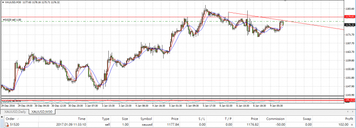 上週1月6日星期5現貨黃金開巿價為1180.50 其後受美元指數打壓 承壓下跌走趨 非農業數雖不及預期令到美元指數短線下降 黃金短線急升 最高見1182.61 但因失業率一下用4.9%下降至4.6% 主要也是更多美國人離開勞動力大軍 市場相信這次降幅只旦是臨時性 但美國不論在就業增長 薪酬 失業率方面都表現良好 反映出持續增長 導致美元指數上升 黃金下降最低見1170.62 最終收巿價在1172.02 整體而言這次非農表現令人失望 上周給出1178.39sell 最後止盈在1173 成功*獲利5個點