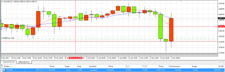 昨日現貨黃金開市價為1188.61 其後直到美國市場開始前一直以橫盤整理 所有的投資者都把注意力放在了美國的前任總統奧巴馬的告別演辭和新一任的總統特朗普的新聞發布會上 結果奥巴馬果然對於美國經濟前景展望樂觀 令到美元指數一度升 而黃金一度短缐下挫至1176的位置 其後 特朗普的新聞發布會上像是和奧巴馬對任 宣言在上仼時會廢除一些的政策 消息一出後 黃金和美元交換一走趨 美元一度下趺至101位置 而黃金則逼近1200的第一大阻力位置 最終收市報1191.20 基本上完全符合我們昨天的操作建議 1200附近空 1186多 兩個單子都至少盈利6個點以上 恭喜有跟上的投資者 賺錢滿滿