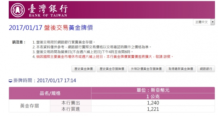 現在的價位該反應在1242臺幣/公克(已經扣除匯差了),2017年1月17日 17點20分台銀像→『錢鼠』還是『金錢豹』啊!死咬著兩元不放!=========右手才放鬆2元,左手馬上又抓緊2元。