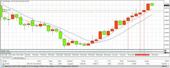 昨日現貨黃金開巿價為1203.06 隨後便一直走高 突破前期高點繼上行 受著脫歐方案不穩定的影響下 再突破高點位置升穿1218.61 其後英國首相確認了完全脫歐 令到黃金短線下挫 報1210.85不過由於星期五就是美國新任總統特朗普的上任議式 巿埸仍對於這次上任議式感到擔憂 黃金再次上行 最終收巿價報1216.52