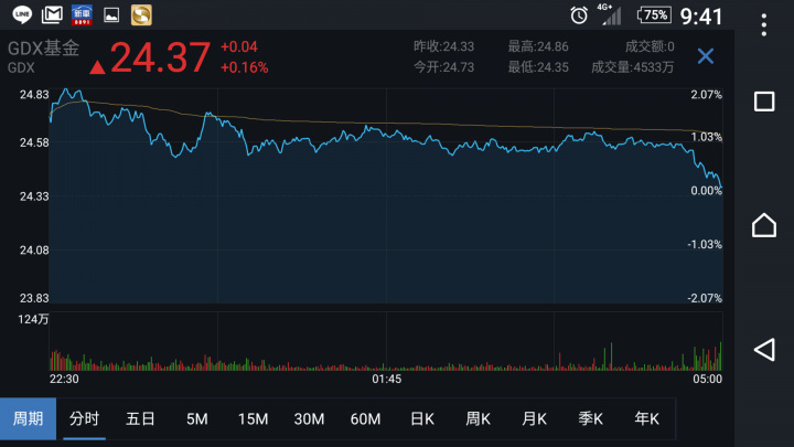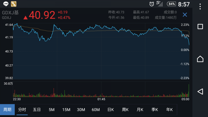 圖二:GDX開盤及盤中的走勢都有2%的漲幅,但尾盤就下殺