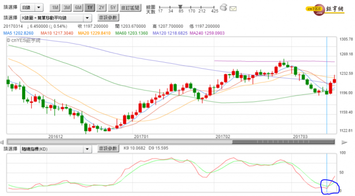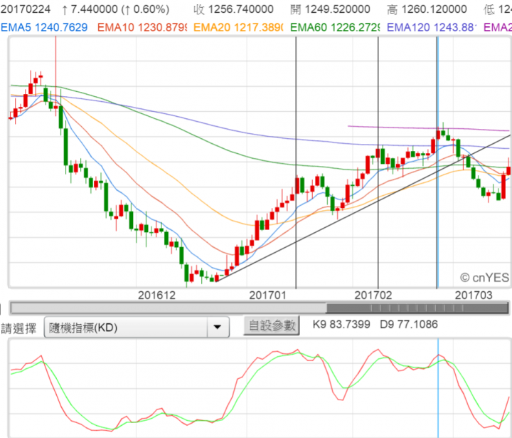 問題一:就3/14的收盤線圖來看,5日均由上往下穿過60日均,理論上會開始下跌為賣出點