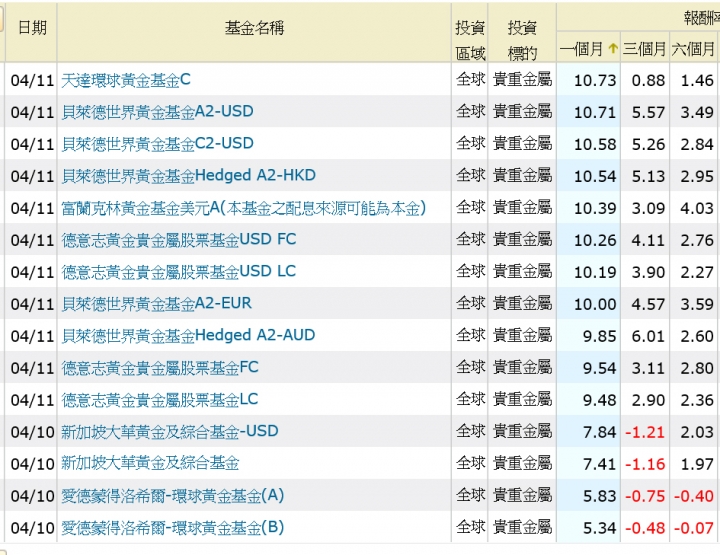 :誰能告訴我 黃金基金 漲幅最兇的是哪一支...
