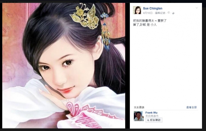 3。她離開黃金版時,也在Fb同時更新一張真美的脫俗人頭像,並作了首七言絕句,但沒說這個神仙姊姊是不是她,但您卻未經同意把她的這張真人相PO到黃金站,並告知大家這就是她